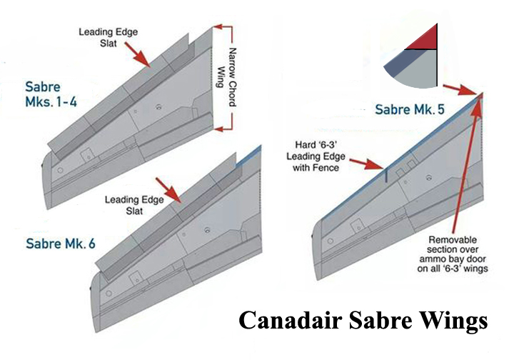 The new more tapered Sabre Mark 5 hard wing was wider by 6 inches at the root and 3 inches at the tip. This necessitated the addition of a small removable triangular piece so that the same ammo bay door could be used. Introduced by North American in 1952 on the F-86F-25, the ‘6-3’ wing was also retrofitted as a kit to F-85Es and ex-RAF Mark 4s. By delaying the trans-sonic buffet, the new wing allowed Sabre pilots more “usable Gs” at high Mach numbers and altitudes. The Sabre could now turn inside all MiGs, including the supersonic MiG-19 and even the MiG-21.