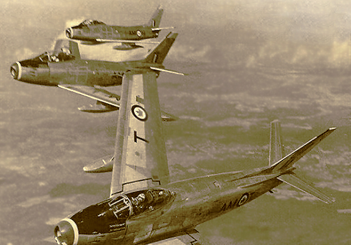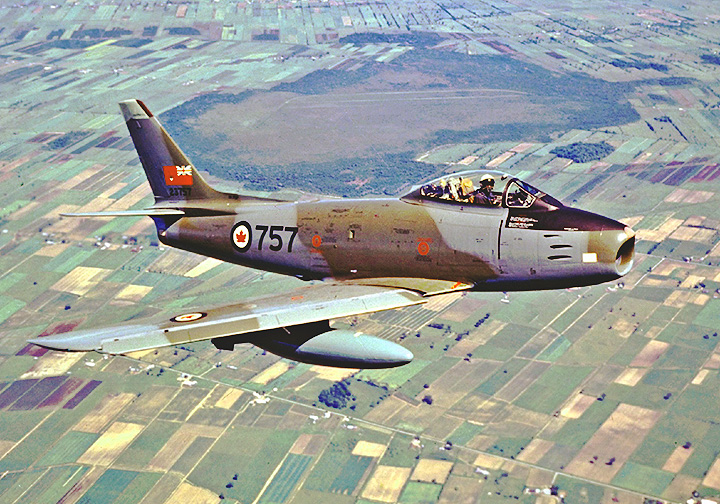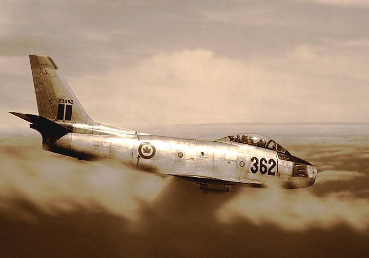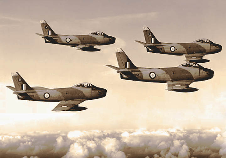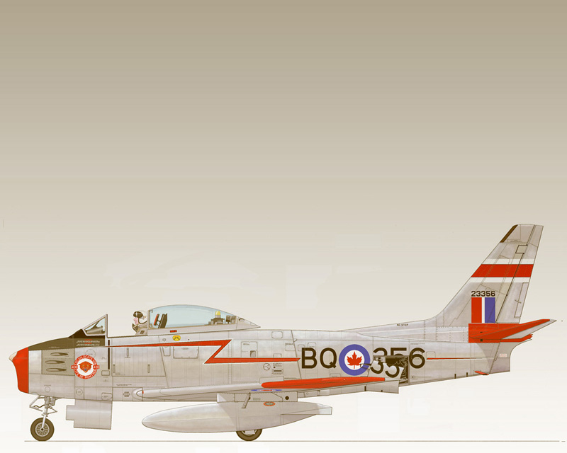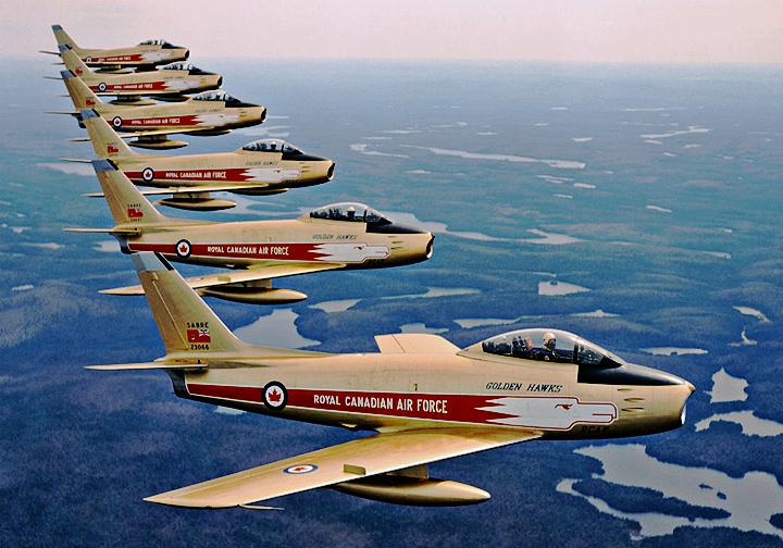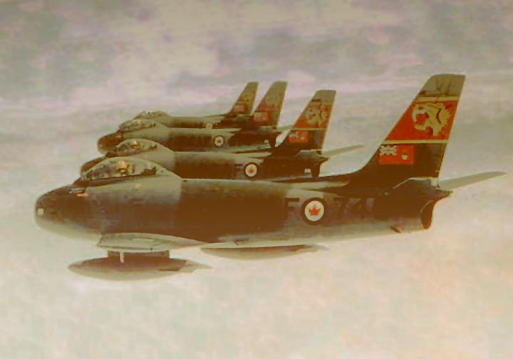 A tight formation of Sabre Mark 6s from No. 439 “Sabre-Toothed Tiger” Sqn., RCAF, 1 Air Div., based at Marville, France until 1963. The RCAF got 390 Mark 6s (CL-13Bs) of the 655 built.