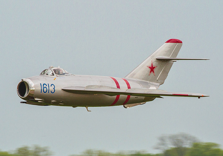 The improved and even faster MiG-17 first flew in 1950 and was in production by 1952. It had a longer fuselage and wings, and a more powerful engine with an afterburner. This meant that it could escape the Sabre by going vertical. However, the generous wing fences would indicate air flow issues at lower speeds. Compressibility problems were also known at higher speeds. This MiG-17 is privately owned (formerly Warsaw Pact) and has appeared at air shows in the U.S.