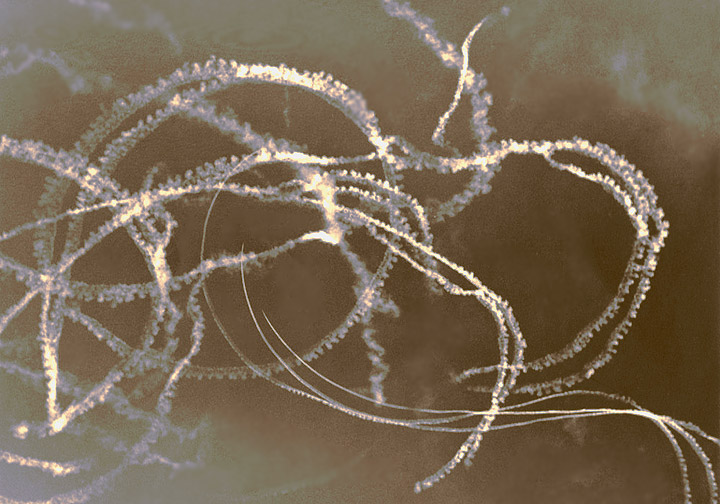 Contrails of a Sabre dogfight in European skies, 1962. Combat usually takes place below 30,000 feet and subsonic speed. The object is to turn inside the other guy to get a shot at him.