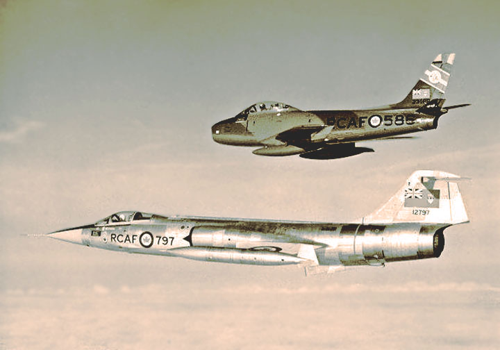 The CF-104 (same as the Lockheed F-104G) began replacing the RCAF Sabres in NATO service in 1962 – 1963, about the same time as the Luftwaffe. The Starfighter was twice as fast (up to 1,450 mph), could fly higher, and had radar, but with those small wings lacked the agility of the Sabre. The new role for the RCAF CF-104s in NATO would be strike-reconnaissance. The era of the classic dogfighter was apparently over, or was it?