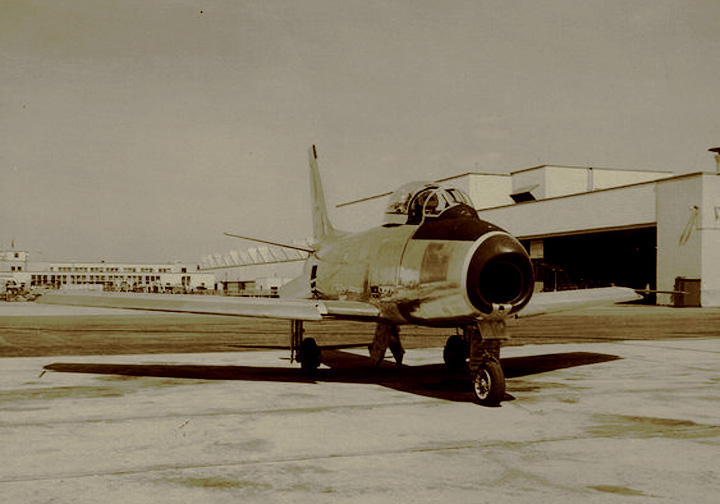 The one and only Sabre Mark 1 was an F-86A assembled from parts shipped to the Canadair plant at Cartierville, Quebec, from California. It first flew on Aug. 9, 1950, powered by a J-47-GE-7 axial flow turbojet of 5,000 lbs st. Note the conventional horizontal tail.